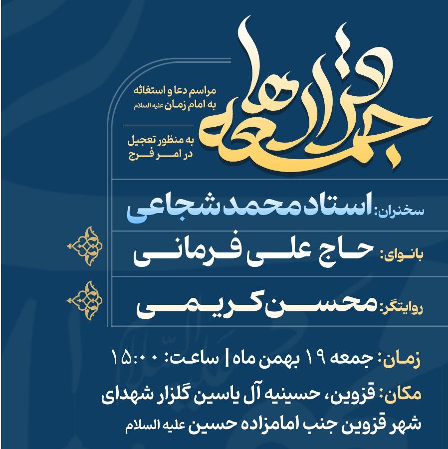 در این مراسم استغاثه که ساعت ۱۵:۰۰ در حسینیه آل یاسین گلزار شهدای شهر قزوین آغاز میشود، استاد شجاعی سخنرانی میکنند. علاوه بر سخنرانی استاد شجاعی، مدیحه سرایی با نوای حاج علی فرمانی و قرائت زیارت آل یاسین و قرائت دعا و نماز استغاثه زینت بخش مراسم خواهد بود.